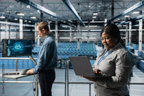 Server farm teamworking admins using laptop to do infrastructure AI machine learning automatization. Data center software developers doing maintenance using artificial intelligence