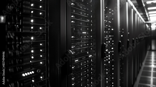 Server rack with multiple servers, clean layout, efficient cooling system, side view, illustrating highperformance computing, advanced tone, Monochromatic Color Scheme.