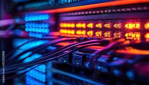 Server Rack with Network Cables and Illuminated Ports