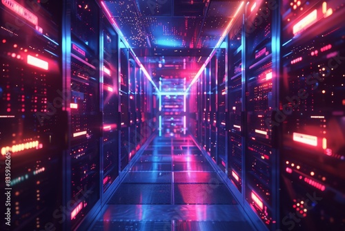 Server racks in computer network security server room data center, 3d rendering. Computer digital drawing