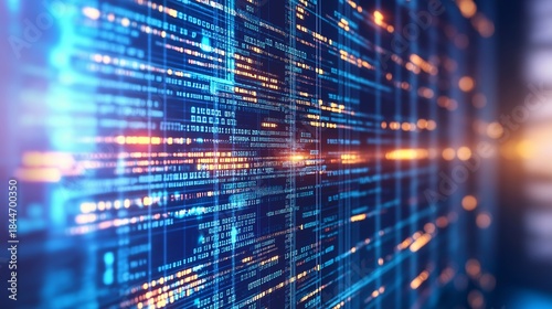 Server racks with glowing digital data flow. Big data network processing and storage