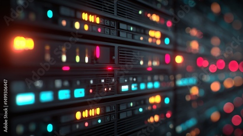 Server room data center filled with electronic hardware. Lights blink on the units in various colors. Server banks are blurred in the background.