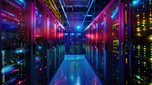 Server room data center with racks and rows of servers. Concept of modern datacenter infrastructure, cyber security, and high performance computing technology.