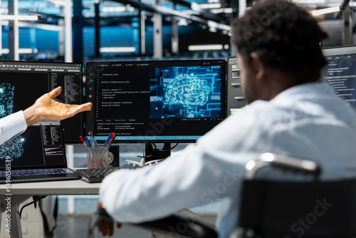Server room facility worker using artificial intelligence to perform demanding computing tasks. Computer scientist in data center uses AI technology for machine learning workloads