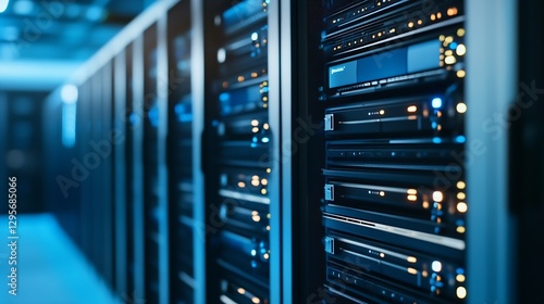 Server room filled with data storage hardware, blue lighting, digital technology equipment, high-tech environment : Generative AI