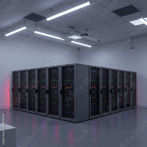 Server Room Infrastructure with Glowing Network Racks.