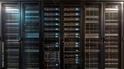 server room with data center racks, digital processing and cloud storage systems, secure IT infrastructure for enterprise-level data management and communication