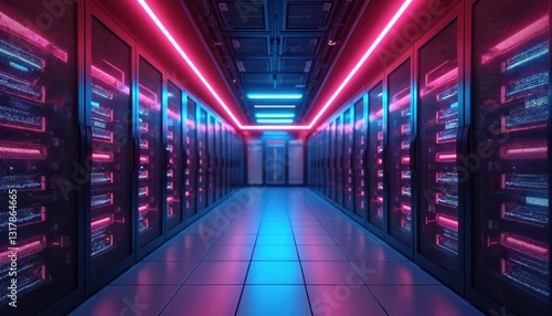 Server room with neon lights tech infrastructure for data management, storage. Advanced hardware, powerful network, software. Modern optical computing equipment for transmission, backup. Industry