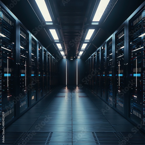 Server Room with Rows of Racks and Bright Lights
