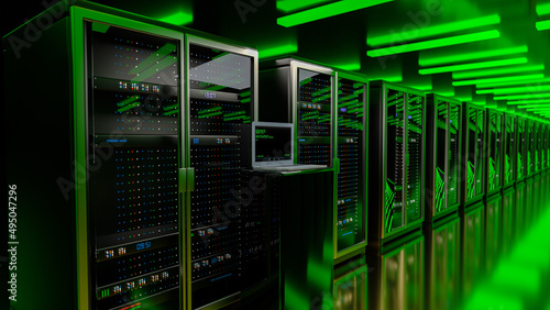 Servers. Servers room data center. Backup, mining, hosting, mainframe, farm and computer rack with storage information. 3d rendering
