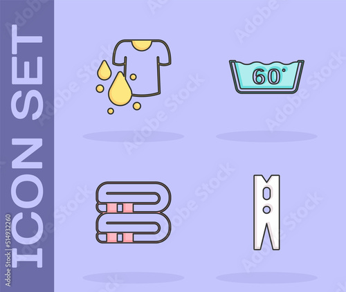 Set Clothes pin, Dirty t-shirt, Towel stack and Temperature wash icon. Vector