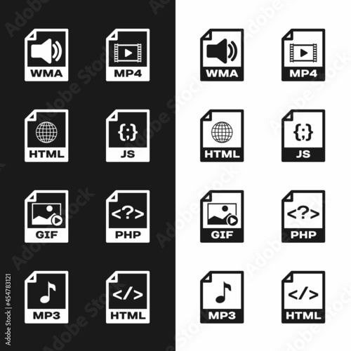 Set JS file document, HTML, WMA, MP4, GIF and PHP icon. Vector