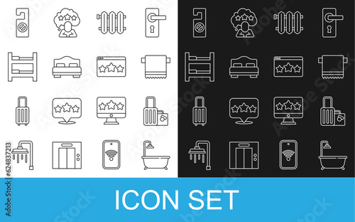 Set line Bathtub with shower, Suitcase, Towel on hanger, Heating radiator, Hotel room bed, Please do not disturb and Five stars rating review icon. Vector