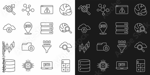 Set line Calculator, Search cloud computing, globe, Browser with exclamation mark, Data analysis, Cloud lock, data and Server icon. Vector