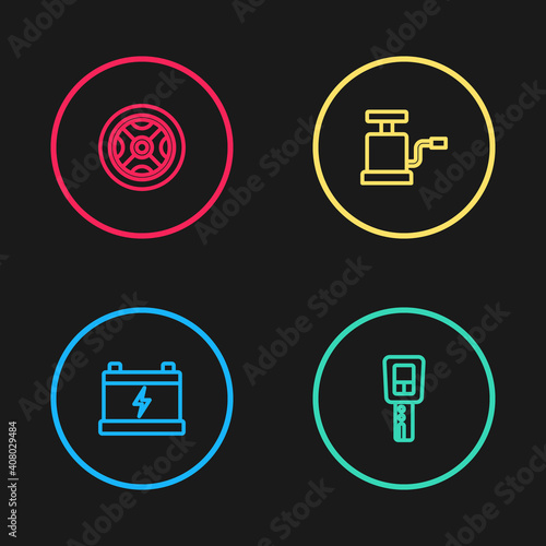 Set line Car battery, key with remote, air pump and wheel icon. Vector.