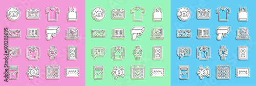Set line Concert ticket, CD disk award in frame, Laptop with music, T-shirt, Sound or audio recorder, Stacks paper money cash, Vinyl and Money gun icon. Vector