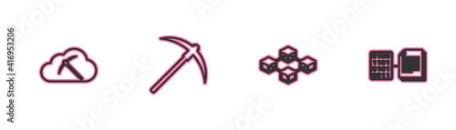 Set line Cryptocurrency cloud mining, Blockchain technology, Pickaxe and Smart contract icon. Vector.