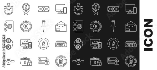 Set line Cryptocurrency coin Bitcoin, Money with lock, Envelope, Stacks paper money cash, Coin euro symbol, Address book, Stopwatch and Push pin icon. Vector