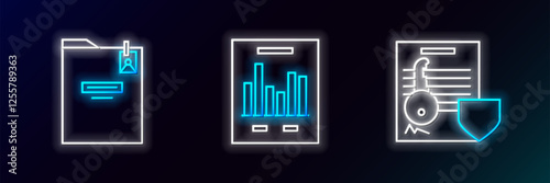 Set line Document with key with shield, Personal folder and graph chart icon. Glowing neon. Vector