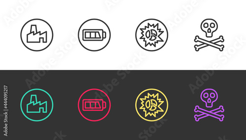 Set line Factory production, Battery, Bomb explosion and Bones and skull warning on black and white. Vector