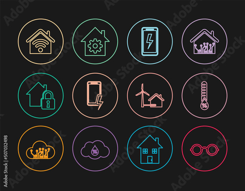 Set line Glasses, Humidity, Mobile charging battery, House under protection, Smart home with wi-fi, wind turbine and settings icon. Vector