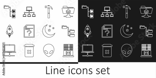Set line Mail server, Folder tree, Hammer, Unknown document, Rocket ship with fire, Moon and stars and Computer network icon. Vector