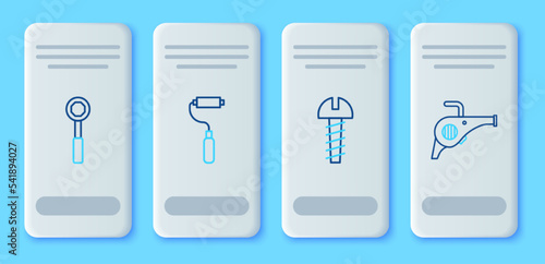 Set line Paint roller brush, Metallic screw, Wrench spanner and Leaf garden blower icon. Vector