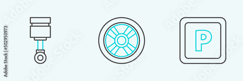 Set line Parking, Engine piston and Car wheel icon. Vector