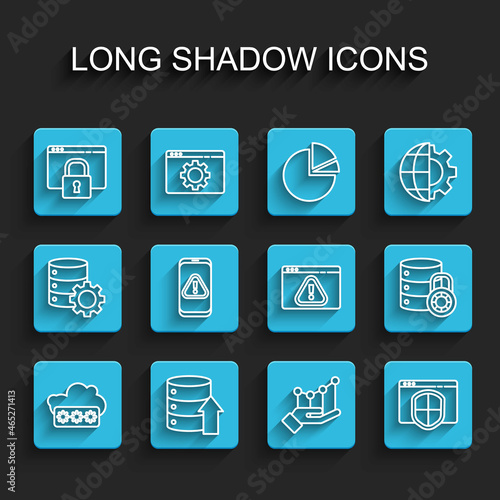 Set line Password protection, Server, Data, Web Hosting, Secure your site with HTTPS, SSL, Pie chart infographic, Browser shield, Mobile exclamation mark, security lock and icon. Vector