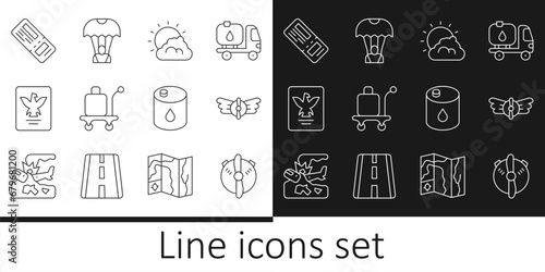 Set line Plane propeller, Aviation emblem, Sun and cloud weather, Trolley baggage, Passport, Airline ticket, Barrel oil and Parachute icon. Vector