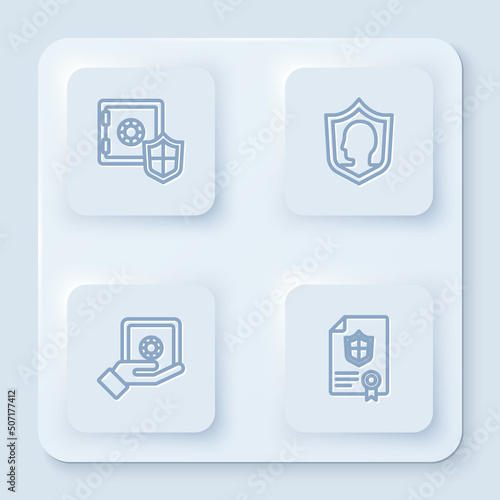 Set line Safe with shield, Life insurance, hand and Contract. White square button. Vector