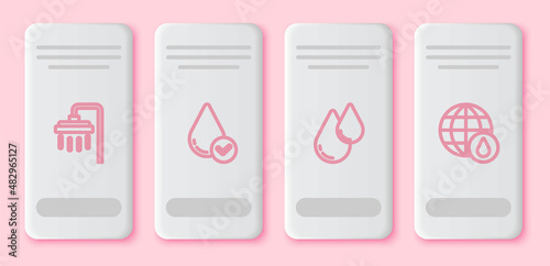 Set line Shower, Water drop, and Earth planet in water. White rectangle button. Vector