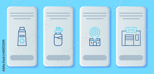 Set line Sport bottle with water, Bicycle repair service, Sunscreen cream in tube and icon. Vector