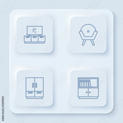 Set line TV table stand, Armchair, Wardrobe and Library bookshelf. White square button. Vector