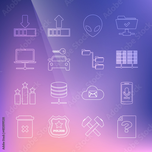 Set line Unknown document, Mobile recording, Server, Data, Web Hosting, Alien, Car rental, Computer network, Loading and Folder tree icon. Vector
