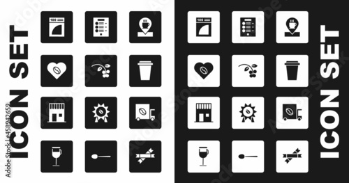 Set Location with coffee cup, Coffee bean, branch, Lovers, paper filter, to go, menu, street truck machine and shop icon. Vector