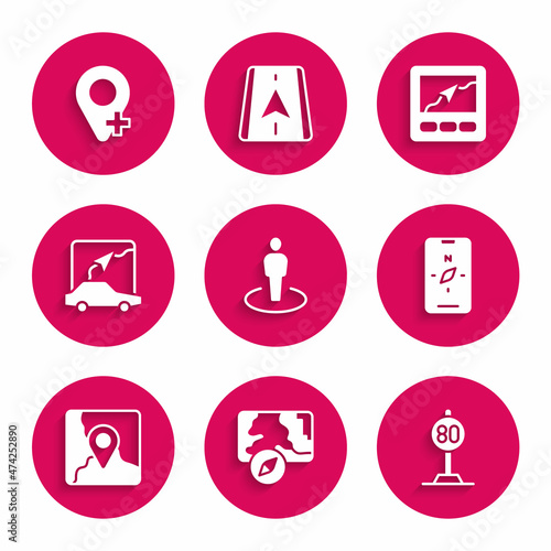 Set Location with person, City map navigation, Speed limit traffic, Compass mobile, Folded location marker, Gps device and icon. Vector