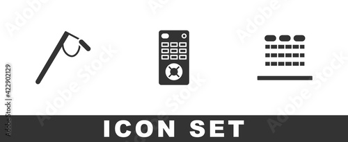 Set Microphone, Remote control and Cinema auditorium with seats icon. Vector