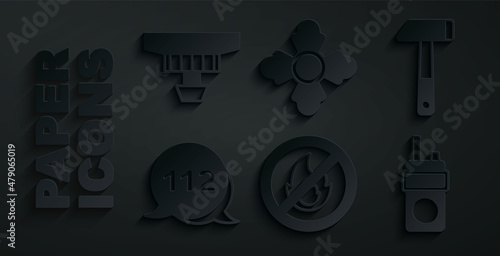 Set No fire, Hammer, Emergency call, Walkie talkie, Firefighter and Smoke alarm system icon. Vector