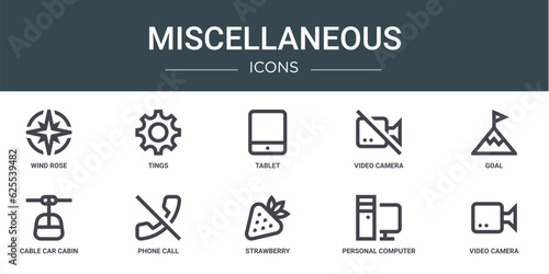 set of 10 outline web miscellaneous icons such as wind rose, tings, tablet, video camera, goal, cable car cabin, phone call vector icons for report, presentation, diagram, web design, mobile app