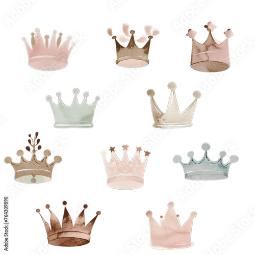 Set of 12 cute watercolor crown cliparts, minimalistically drawn in soft, muted colors on white background. Perfect for stationery, invitations, and baby shower decorations