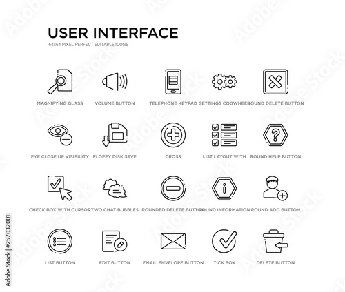 set of 20 line icons such as rounded delete button with minus, two chat bubbles, check box with cursor, list layout with check boxes, cross, floppy disk save button, eye close up visibility button,