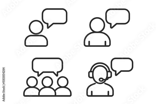 Set of 4 Communication Line Icons – People, Speech Bubble, Talking, Discussion, Teamwork, Customer Service, Web and Mobile App Interface, Group Conversation, Call Center, Minimal Outline Vector