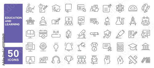 Set of 50 line icons related to education, learning, school,university, online training, Editable stroke. Vector illustration