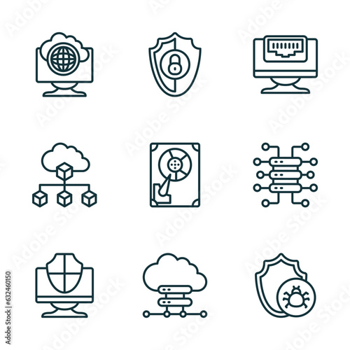 set of 9 linear icons from internet security concept. outline icons such as internet connection, insecure, ethernet, computer security, cloud server, malware vector