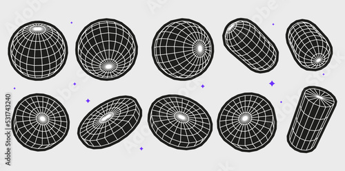 Set of abstract geometric shapes or trendy brutalism style elements inspired brutalism. Flat vector illustration with 3d wireframe models. Concept psychedelic techno style.