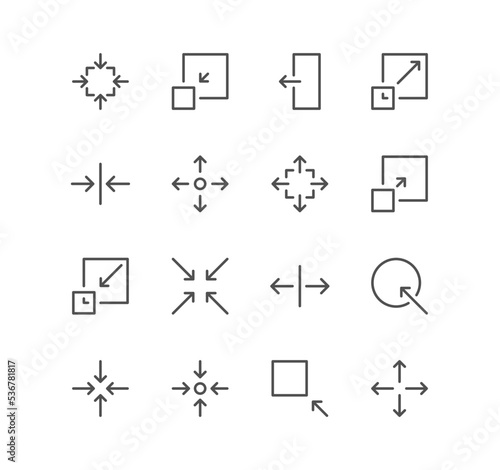 Set of arrow and technology icons, size, scale, decrease, edit, resize, line, view, reduce and linear variety vectors.