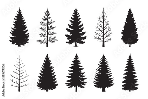 Set of black coniferous tree silhouettes for forest landscape design and natural wood environment decoration
