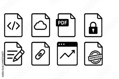 Set of black file icons with symbols for code, cloud, PDF, lock, analytics, and approval. Ideal for digital documents, data security, and tech interfaces. Isolated on transparent background