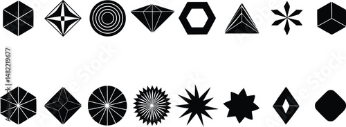 Set of brutalist abstract geometric shapes, Figures, stars, spiral flower and circle isolated on transparent background